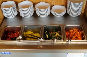 They have a small assortment of side dishes (varies with restaurant and day) including soup, kimchi, radish, and boiled eggs for instance which is all self-serve.