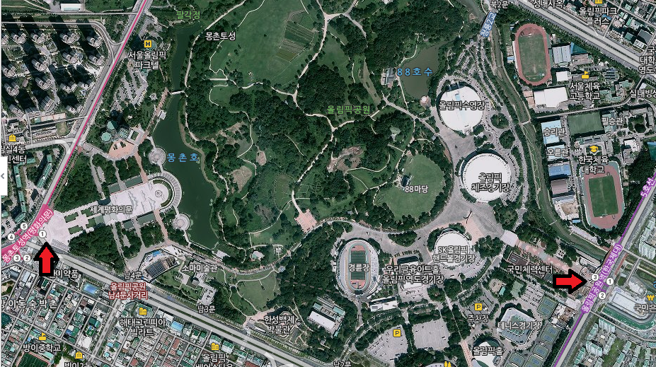 Address: 426, Ollimpik-ro, Bangi-dong, Songpa-gu, Seoul-si 88 서울특별시 송파구 올림픽로 426 (방이동)Once you exit from Mongchontoseong Station, you will see the unmistakable Olympic structure. They have a flame at the center that burns continuously, and all sorts of restaurants and recreational areas. Beyond this structure is another monument with flags of the world surrounding it. There’s also a small lake behind that.