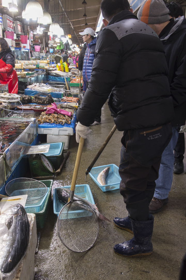 There appears to be some sort of organization with the vendors by rows. The first row you encounter will be full of live seafood and fish, with the middle rows a mix of fish on ice, and the last rows filled with prepped banchan (반찬). There are some exceptions and I do recommend going through the whole market to find the more unique vendors.