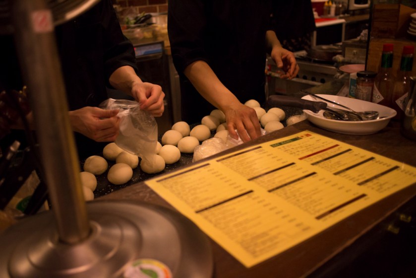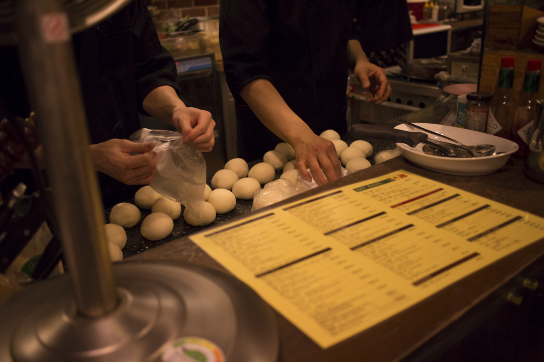 Fresh pizza dough being made.