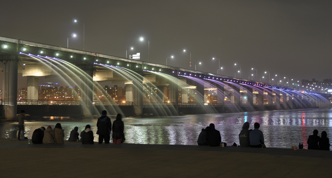 Banpo Bridge (반포대교) is the result of a citywide beautification effort resulting in the world’s longest bridge fountain, coordinating streaming water and lights to music in rhythmic manner. The show plays all week, with peak times being at night. Be sure to check the schedule and directions here and beware there are no shows in the winter. It’s similar to Cheongyecheon Plaza, but is obviously quite a bit more dynamic!