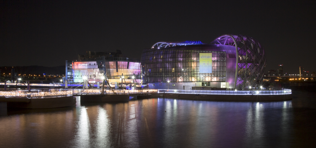 The area is also home to “Some Sevit” which is a complex of buildings floating along the Han River. They light up and change colors perhaps even more frequently than the Banpo Bridge itself! It adds even more flashiness to Seoul’s night scene and is home to a bunch of accommodations, including a buffet restaurant!