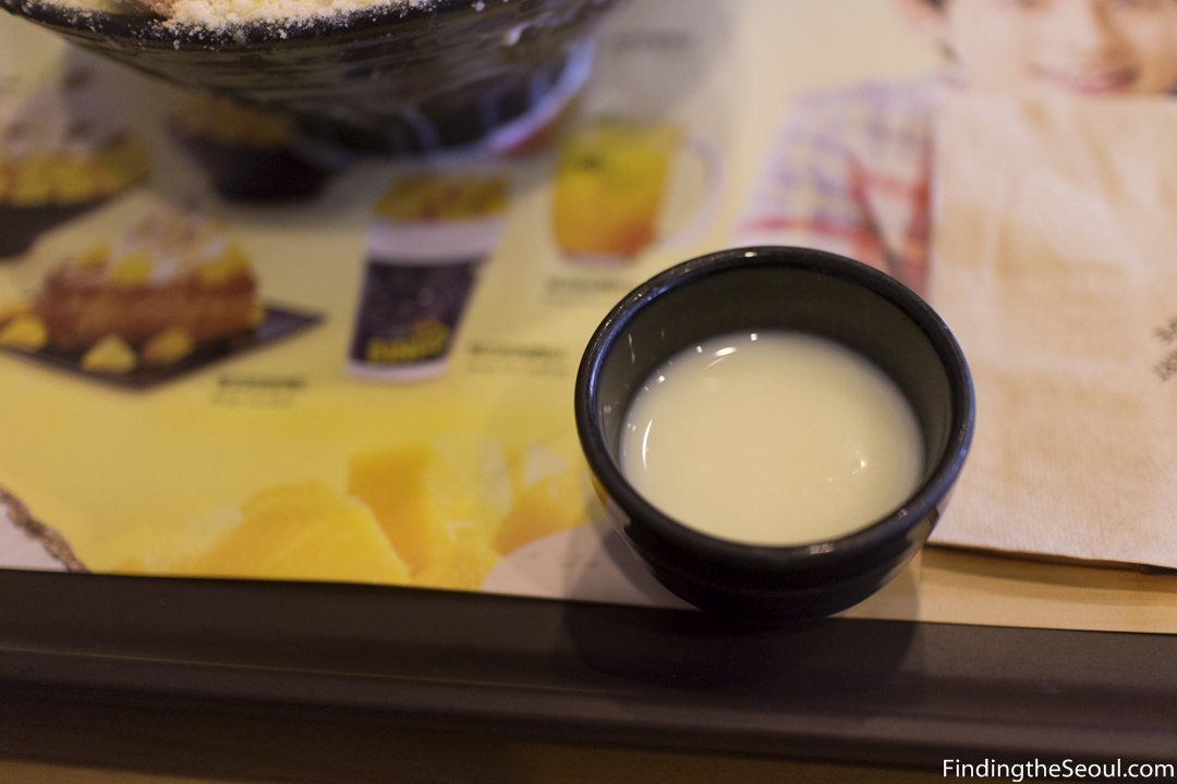 The cheese sulbing is shaved ice covered with shaved almonds, cheesecake bites, Parmesan (?) cheese, and a scoop of ice cream topped with one cherry-looking fruit. The menu showed a lot more fruits, but that’s the only inaccurate representation I felt. Otherwise, I was pretty impressed with the real thing.